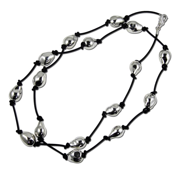 Baroque Pearls of Sterling Silver knotted onto black leather cord. 37" long (more or less) with lobster claw clasp.